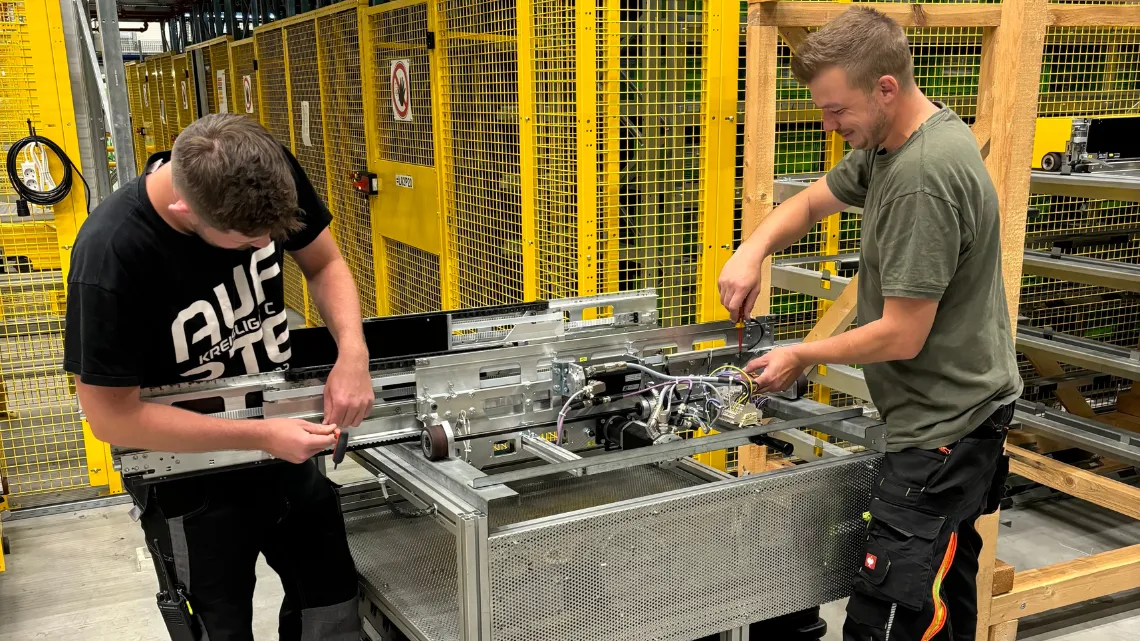 "Every intervention is like open-heart surgery for us", says Sascha, describing his team's responsibility. Ten colleagues work under his leadership to ensure that the systems remain operational at all times. Covering more than 30,000 m², two highly automated warehouses – a miniload with 145,000 storage locations and a shuttle warehouse with 46,400 storage locations – form the heart of the center. They are complemented by automatic picking machines, conveyor technology, automatic carton erectors and sealers, label systems, and complex sensor technology that efficiently control the flow of materials.